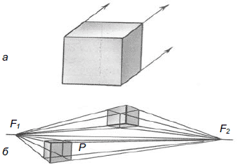 Рис. 1.7. Изображение объектов: а – в аксонометрии; б – в перспективе