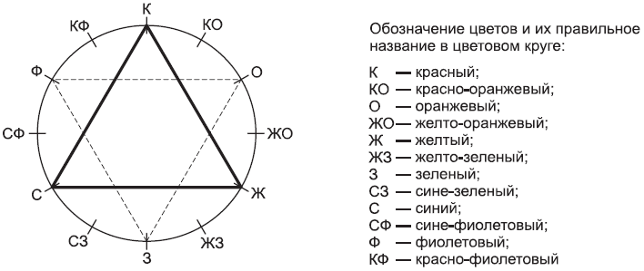 Говоря о цветоведении, нельзя обойти вниманием технику сочетания цветов. Для этого используется цветовой круг Гете (рис. 1.20). Естественные цвета в нем сочетаются с субтрактивной цветовой схемой, о которой было сказано выше. В круг вписаны два треугольника, первый из которых соответствует первичным, а второй – вторичным цветам. Промежуточные цвета являются смешанными цветами второго порядка. Подобное расположение позволяет выделить определенные сочетания, хотя мода на них менялась с течением времени.