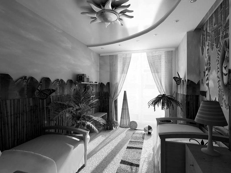 И конечно, необходимо помнить о влиянии цвета на восприятие человеком той или иной сцены. Правильно выбранный фон позволяет улучшить как композицию в целом, так и ее отдельные объекты. Белый, черный и серый цвета фона считаются нейтральными и открывают возможности для полета фантазии дизайнера. Но не следует забывать, что светлые предметы на белом фоне выглядят плоскими. На сером фоне недостаточно ярко смотрятся оттенки желтого. Маленькие помещения не стоит оформлять в темных или интенсивных тонах, так как это зрительно уменьшает их объем. Исключение составляют прихожие и холлы – здесь темные тона создают ощущение строгости и служат фоном для восприятия дальнейшей цветовой гаммы. Холодные голубые тона оптически раздвигают стены и потолки, создают ощущение простора. Сцена, основой которой являются теплые бежевые оттенки, освещенная ровным мягким светом, создаст у человека ощущение спокойствия, уюта и тепла. Интерьер детской комнаты с потолком и стенами цвета неба, обоями с имитацией джунглей и изображением героев известного мультфильма, декором в виде бабочек будет создавать атмосферу веселой непринужденности и сказочного мира (рис. 1.22). Напротив, сцена, объекты которой окрашены в локальные цвета холодных оттенков и неравномерно освещены (имеется в виду резкое разделение на темные и светлые области), вызовет у человека чувство беспокойства и неприятные ощущения. Данное свойство человеческой психики используют создатели современных компьютерных игр. Возьмем в качестве примера недавно вышедшую игру жанра экшен – «INFERNAL». Неповторимый антураж, созданный ее разработчиками, игра светотени вкупе со спецэффектами заставят провести несколько незабываемых часов за монитором компьютера.