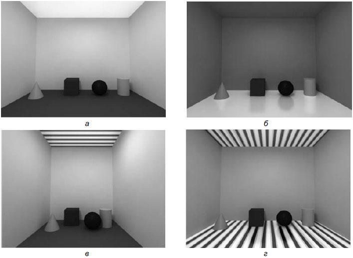 Иллюзия высокого помещения создается отсутствием границы между стенами и потолком. Подчеркнуть подобное ощущение можно контрастным цветом пола (рис. 1.56, а, б ). Этого можно достигнуть как дополнительным освещением полов, так и применением крупного контрастного рисунка или полировки. Зрительное увеличение высоты помещения достигается также путем размещения на потолке точечных источников света.