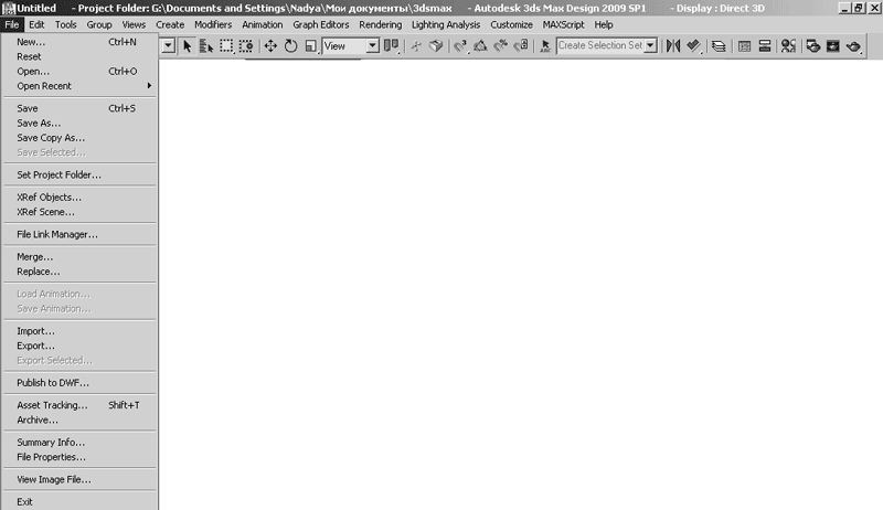 В верхней части окна программы расположено главное меню, команды которого позволяют управлять практически всеми функциями 3ds Max 2009. В меню File (Файл) (рис. 2.5) расположены команды открытия и создания файлов, а также их сохранения и импорта.