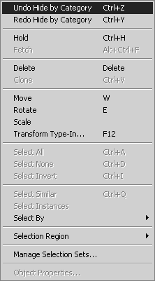 Далее расположено меню Edit (Правка) (рис. 2.6), которое содержит команды отмены и повторения операций, выделения, копирования, удаления и настройки свойств объектов, а также вращения, перемещения и масштабирования объектов, сохранения и восстановления состояния сцен.
