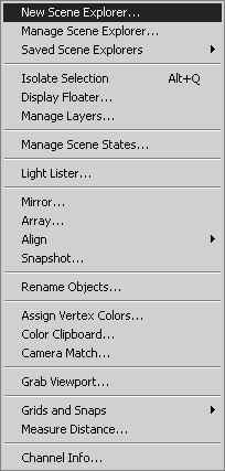 Команды меню Tools (Сервис) (рис. 2.7) позволяют применять к объектам различные преобразования, обеспечивают вызов различных диалоговых окон и сервисных программ. Именно здесь вы найдете инструменты для измерения расстояния между объектами или длины объектов, а также диалоговое окно, позволяющее управлять параметрами всех осветителей сцены одновременно. Названия команд, которые невозможно активировать в данный момент, выделены бледно-серым цветом, имена всех прочих команд имеют черный цвет. Выбранный пункт меню выделяется синим. Выбор команды, справа от которой присутствует стрелка, приводит к появлению дополнительного меню. В новой версии в данном меню появился пункт Grids and Snaps (Сетка и привязки), выбор которого открывает окно настройки привязок. Данное окно можно также открыть из меню Customize (Настройки). Кроме того, в меню Tools (Сервис) находится нужная команда Manage Scene States (Управление состояниями сцены), позволяющая быстро сохранить в файле указанные пользователем свойства сцены, например схему освещения или материалы.