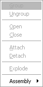 Меню Group (Группа) (рис. 2.8) содержит команды создания, редактирования и разъединения двух видов организованных совокупностей объектов – групп и сборок. Объединение объектов в группу производится командой Group (Сгруппировать). Разъединение группы и доступ к ее отдельным объектам осуществляются посредством команд Ungroup (Разгруппировать) и Open (Открыть группу).