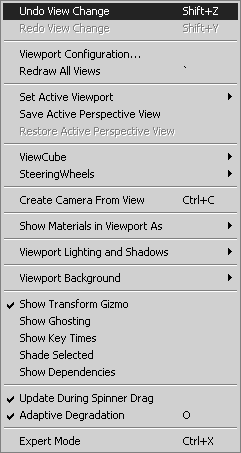 В меню Views (Проекции) (рис. 2.9) расположены инструменты управления всеми аспектами отображения объектов в 3ds Max. Например, выбрав команду Grids (Координатные сетки), а затем в появившемся подменю – команду Show Home Grid (Показать исходную сетку), вы поменяете видимость координатной сетки в активном окне проекции. В 3ds Max 2009 в этом меню добавились пункты Viewport Configuration (Настройка видового окна), который перекочевал из меню Customize (Настройка), ViewCube (Видовой куб) и SteeringWheel (Штурвал) с настройками этих инструментов. Из данного меню теперь можно установить в активное окно камеру, заменив установленный вид видом из камеры. Достаточно выбрать пункт Create Camera From View (Создать камеру из вида). Инструменты пункта Show Materials in Viewport As (Показать материалы в видовом окне как) позволяют отображать в видовых окнах материалы, визуализированные в реальном времени на объектах. С помощью пункта Viewport Lighting and Shadows (Освещение и затенение видовых окон) можно отобразить форму светового пучка установленного в сцену осветителя, а также в реальном времени отобразить тени, образуемые освещенными объектами.