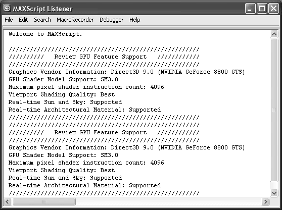 Набор инструментов Review (Пересмотр), реализованный в 3ds Max 2009, позволяет в интерактивном режиме увидеть в видовых окнах тени от источников освещения и модели с архитектурными материалами для модуля Mental Ray. Данный режим отображения теней в видовых окнах можно включить в настройках видового окна, а также в описанном выше меню. Он будет активен в том случае, если в качестве графического драйвера будет установлен Direct3D и видеоадаптер поддерживает работу с шейдерной моделью версии 2.0 и выше. Чтобы проверить возможности видеокарты, нужно выбрать в меню Views (Виды) пункт Diagnose Video Hardware (Тест видеоадаптера). Появится окно MAXScript Listener, в котором будут отображены результаты теста, включая краткое описание режима отображения теней в видовых окнах (рис. 2.10).