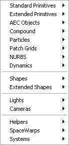 Меню Create (Создать) (рис. 2.11) предоставляет доступ к инструментам создания различных объектов 3ds Max 2009: стандартных и улучшенных примитивов, источников света, камер и т. п. Альтернативой данному меню является командная панель Create (Создать). В одной из прошлых версий Max в меню Create (Создать) появилась новая команда – Extended Shapes (Улучшенные формы). Она открывает дополнительное меню с командами, позволяющими создавать профили сечения типовых элементов строительных конструкций – швеллеров, уголков, тавровых и двутавровых балок и т. п.