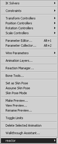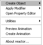 Меню reactor (Реактор) (рис. 2.13) включает в себя элементы управления динамикой взаимодействия объектов, с помощью которых можно наделить трехмерный объект сцены реальными физическими свойствами. В этой версии данный пункт был убран из главного меню и перенесен в меню Animation (Анимация). (В приложении А рассматривается динамика взаимодействия объектов с помощью модуля reactor (Реактор).)