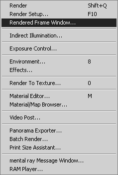Меню Rendering (Визуализация) (рис. 2.16) содержит команды, отвечающие за визуализацию сцены и наложение различных эффектов. Здесь же находится команда запуска редактора материалов. Особенно хочется отметить такой полезный инструмент, как Batch Render (Пакетная визуализация), позволяющий просчитывать несколько изображений или анимационных последовательностей подряд и сохранять в различных файлах. Команда Render Setup (Настройки визуализации) открывает одноименное диалоговое окно (рис. 2.17), предназначенное для выбора параметров визуализации. Так как по умолчанию при открытии программы установлен визуализатор Mental Ray, в этом окне имеются следующие вкладки: