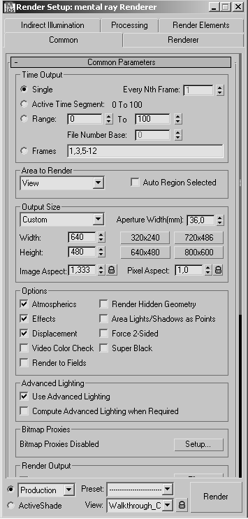 • Common (Общие параметры) – содержит область выбора интервала времени и диапазона визуализируемых кадров, настройки размеров выходного изображения, свиток выбора активного визуализатора и некоторые другие параметры.