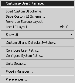 Меню Customize (Настройка) упоминалось выше. Именно тут содержатся команды настройки, сохранения и загрузки описаний элементов интерфейса (рис. 2.19). Начиная с одной из прошлых версий, за настройку пользовательских и системных маршрутов доступа к файлам отвечают отдельные команды.