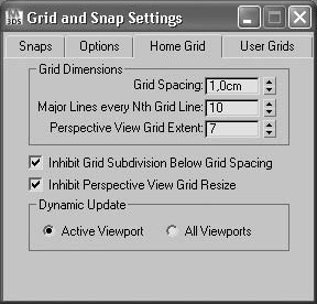 2. Далее нужно указать параметры координатной сетки. Выберите в меню Tools (Сервис) команду Grid and Snaps (Сетка и привязки) ? Grid and Snap Settings (Настройка сетки и привязок) и перейдите на вкладку Home Grid (Исходная сетка) открывшегося диалогового окна. В поле Grid Spacing (Шаг сетки) введите значение 1,0 см (рис. 2.28). В результате расстояние между вспомогательными линиями координатной сетки составит 1 см. Остальные параметры оставьте без изменений. Закройте диалоговое окно.