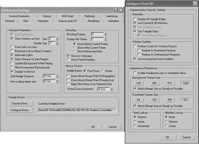 5. Для лучшего отображения текстур в видовых окнах необходимо сделать еще одну настройку. В меню Customize (Настройка) выберите пункт Preferences (Свойства). В открывшемся диалоговом окне выберите вкладку Viewports (Видовые окна). Во вкладке нажмите кнопку Configure Driver (Конфигурация драйвера) и в окне Configure OpenGL (Direct3D) установите максимальные значения в области Background Texture Size (Разрешение текстуры окружения) и Download Texture Size (Разрешение загружаемой текстуры) (рис. 2.30). Кроме того, установите флажки Match Bitmap Size as Closely as Possible (Соответствовать размеру изображения насколько возможно).