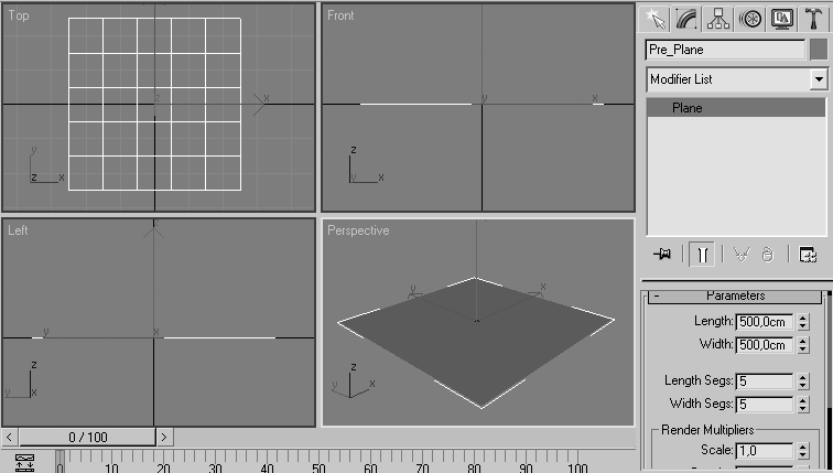 2. Назовите созданный объект и уточните размер плоскости. Для этого перейдите на командную панель Modify (Модификация) и выделите созданную плоскость. На панели модификации отобразятся параметры плоскости и ее название. Назовите плоскость Pre_Plain. В полях свитка параметров Length (Длина) и Width (Ширина) введите значение 500. В полях Length Segs (Сегменты длины) и Width Segs (Сегменты ширины) введите значение 5 (рис. 2.31). Это необходимо для того, чтобы в окне проекции Top (Вид сверху) размер плоскости соответствовал числу сегментов. Внизу установите флажок Generate Mapping Coords (Генерировать координаты карты), это необходимо для наложения карт текстур на объект.