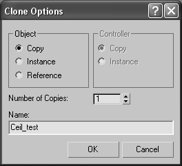 5. Убедитесь, что объект Floor_test по-прежнему выделен, и выберите в меню Edit (Правка) команду Clone (Дублировать). Откроется диалоговое окно Clone Options (Параметры дублирования) (рис. 2.39). Установите переключатель Object (Объект) в положение Copy (Копия), введите в поле Name (Имя) слово «Ceil test» и щелкните на кнопке OK.