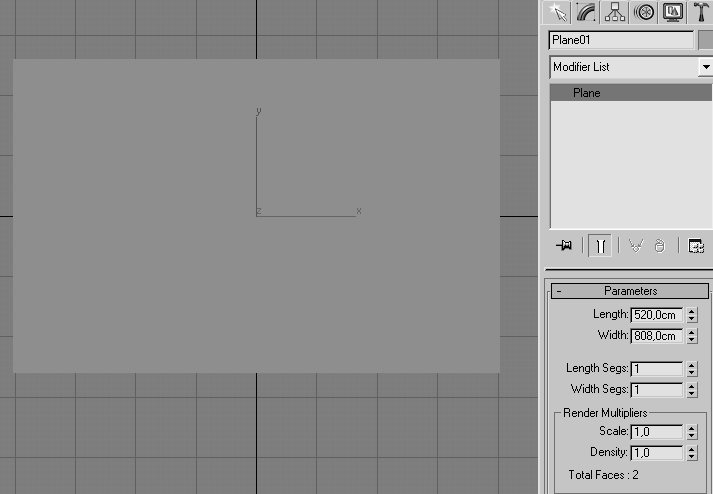 1. Откройте программу 3ds Max 2009, загрузите файл Index.max. Сразу пересохраните файл как Walls_project1.max в папку Models каталога Ar-deco_apartment_project. Перейдите в видовое окно Top (Вид сверху). Щелкните правой кнопкой мыши на названии окна и из контекстного меню выберите тип отображения объектов Smooth + Highlights (Сглаживание + Световые блики). На командной панели Create (Создать) нажмите кнопку Geometry (Геометрия), выберите из списка Standard Primitives (Стандартные примитивы), в свитке Object Type (Тип объекта) нажмите кнопку Plane (Плоскость). В окне вида Top (Сверху) путем нажатия левой кнопки мыши и растягивания создайте плоскость по размеру будущего помещения Length (Длина) – 520 см, Width (Ширина) – 808 см. Перейдите в панель модификации и установите для плоскости один сегмент по длине и ширине (рис. 2.42), а также отредактируйте размеры до нужных. Расположите объект в точке с координатами (0, 0, 0).