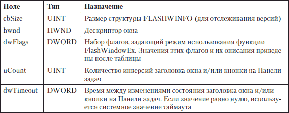• FLASHW_TIMERNOFG – периодически измененяет состояния заголовка окна и/или кнопки на Панели задач до тех пор, пока окно не станет активным;