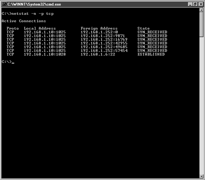 Синхронную атаку можно обнаружить различными инструментальными средствами, например командой netstat, результат действия которой показан на рис. 3.1, или с помощью сетевых систем обнаружения вторжения (IDS).
