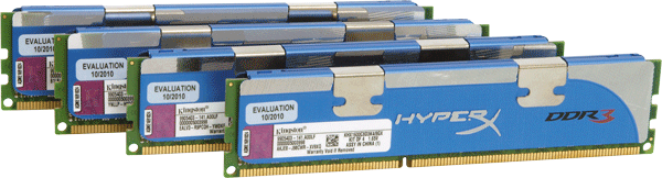 Компания Kingston предлагает комплект 1600-МГц памяти DDR3 с поддержкой XMP, состоящий из четырех 2-Гбайт модулей с пропускной способностью 12 800 Мбит/с и таймингами 8-8-8-24. Это решение для двухканальных платформ (LGA 1156 и будущей 1155) обладает нестандартным напряжением питания – 1,65 В. Если системная плата не обеспечивает автоматического определения напряжения на подсистеме ОЗУ, необходимо выставить нужный вольтаж вручную, чтобы выйти на оптимальный режим работы.