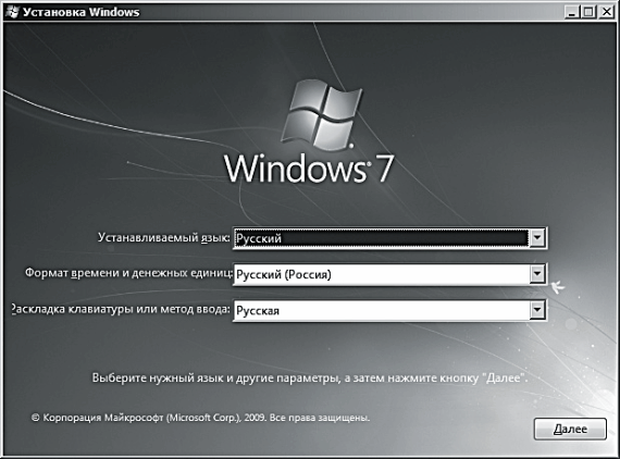 Если вы устанавливаете русскую версию Windows, во всех раскрывающихся списках будет выбран пункт Русский. После выбора вышеуказанных параметров следует нажать кнопку Далее (Next). На экране появится следующее окно Мастера установки Windows 7.