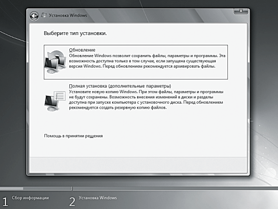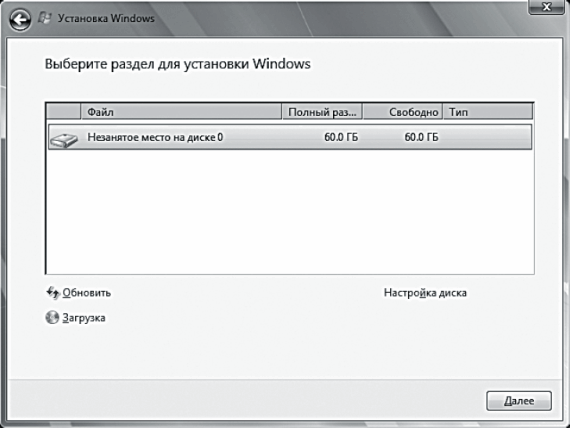 После нажатия кнопки Далее (Next) вам предстоит выбрать вариант установки Windows (рис. 3.3). Возможна полная установка или обновление ранее установленной версии Windows. В последнем случае вы можете обновить установленную на вашем компьютере Windows XP или Vista до Windows 7, при этом все настройки, учетные записи и установленные программы сохранятся. Но о режиме обновления мы еще поговорим. Сейчас мы устанавливаем систему с нуля, поэтому следует нажать кнопку Полная установка (Full Install). Появится окно, в котором вам предлагается выбрать диск, на который будет ставиться система (рис. 3.4).