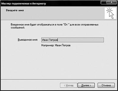 1. В поле Выводимое имя окна Введите имя вам нужно будет написать то имя и/или фамилию, которые вы хотите отображать в своем письме (рис. 2.30). Затем нажмите на кнопку Далее,и вы перейдете к следующему окну.