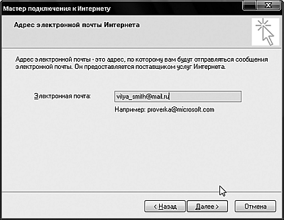 2. В следующем окне Адрес электронной почти Интернета (рис. 2.31) тоже содержится всего одно поле – Электронная почта. Введите в нем ваш уже существующий адрес и нажмите кнопку Далее.