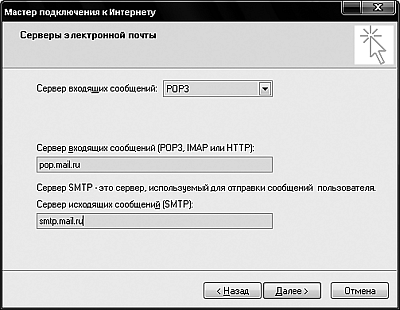 3. Следующее окно Серверы электронной почты (рис. 2.32) содержит уже больше информации, чем предыдущие два. Здесь вам нужно будет ввести серверы входящих и исходящий сообщений в соответствующих полях. Что это такое? Вспомните о том, что я писал ранее о создании почтового ящика, или обратитесь к разделу помощи сайта, на котором вы зарегистрировали свой электронный ящик. Там обязательно будут указаны имена серверов для получения и отправки почты. Например, у mail.ru это pop. mail.ru и smtp.mail.ruсоответственно. После того как вы ввели имена серверов, нажимайте кнопку Далее.