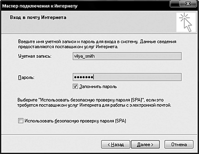 4. Осталось всего одно окно, не переживайте. В следующем окне Вход в почту Интернета (рис. 2.33) вы указываете свои логин и пароль, с которыми регистрировались на сайте электронной почты. Если вы не хотите каждый раз при подключении вводить логин и пароль заново, поставьте флажок Запомнить парольи нажмите кнопку Далее.