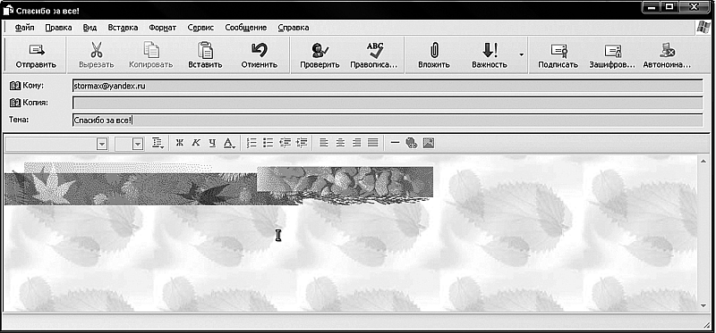 1. Щелкните по меню кнопки Создать сообщение и выберите один из представленных вариантов. Я остановился на шаблоне Природа, что вы можете видеть на рис. 2.38, где открылось окно создания нового сообщения.