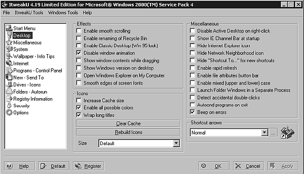 Основные инструменты программы разделены на следующие группы: Start Menu (управление меню Пуск); Desktop (управление внешним видом Рабочего стола); Miscellaneous (управление списком команд контекстного меню, установка фонового рисунка для браузера Internet Explorer и пр.); System (автоматическое закрытие не отвечающих на запросы системы приложений, очистка файла подкачки перед выходом из системы, настройки безопасности); Wallpaper – Info Tips (настройки всплывающих подсказок и фонового рисунка Рабочего стола); Internet (параметры Internet Explorer и Outlook Express); Programs – Control Panel (корректное удаление из системы установленных приложений, а также скрытие различных элементов Панели управления); New – Send To (управление пунктом контекстного меню Отправить); Drives – Icons (выключение отображения дисков в окне Проводника и назначение им определенных значков); Folders – Autorun (управление списком приложений, которые загружаются вместе с операционной системой); Registry Information (системная информация о пользователе, хранящаяся в реестре); Security (настройки безопасности); Options (настройки самого оптимизатора).