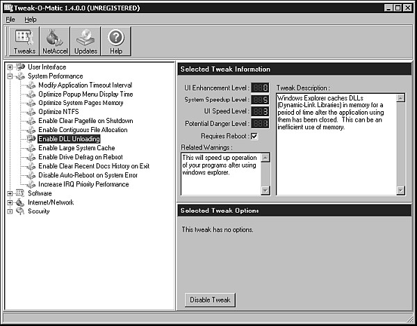 Отличительной особенностью данного оптимизатора (рис. 1.14) является то, что помимо описания каждой настройки Tweak-O-Matic отображает информацию о влиянии определенного параметра на производительность системы, а также предупреждает о возможных проблемах, которые могут возникнуть при использовании той или иной настройки. Эти функции программы будут особенно полезны в тех случаях, когда необходимо настроить систему на максимальное быстродействие.