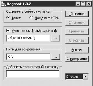 Таким образом, утилита Regshot (рис. 1.23) позволяет сделать следующее: создавать и сравнивать в любой момент времени снимки системного реестра; сравнивать содержимое папок, хранящихся на компьютере; добавлять к отчету произвольный комментарий. Кроме того, можно выбрать язык интерфейса и построения отчета и сформировать отчет в текстовом либо HTML-формате.