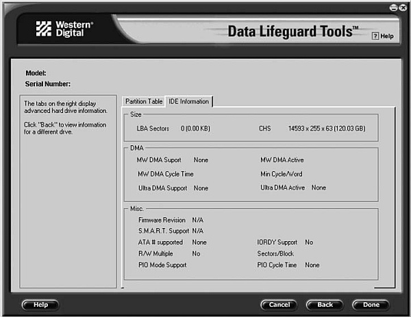 Предназначение утилиты Data Lifeguard Tools – установка в систему новых винчестеров Western Digital. Главное окно программы (рис. 1.24) содержит значки четырех разделов. View Installation Tutorial предлагает пользователю выбрать модель жесткого диска и получить информацию о правильной установке его в системе; Set Up Your Hard Drive связан с предыдущим разделом, в нем описываются практически все действия по установке нового винчестера в системе; раздел Drive-To-Drive Copy предназначен для идентичного копирования папки или раздела с одного винчестера в папку/раздел другого; раздел Hard Drive Information предоставляет полную информацию о подключенных винчестерах: модель, серийный номер, поддерживаемые технологии и разделы, имеющиеся на диске.