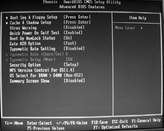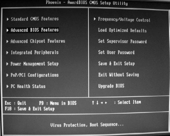 Рис. 1.4. Подменю Advanced BIOS Features (фотография экрана)