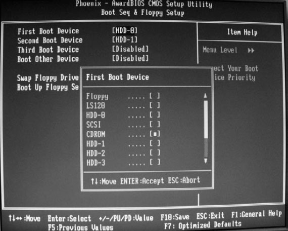 Раскроется меню. В нем нужно изменить устройство, с которого должна производиться загрузка компьютера. Перейдите с помощью клавиш управления курсором к пункту First Boot Device и нажмите клавишу Enter, чтобы открыть особое меню (рис. 1.5). В нем, используя все те же клавиши управления курсором, переместитесь к варианту CDROM и нажмите Enter.
