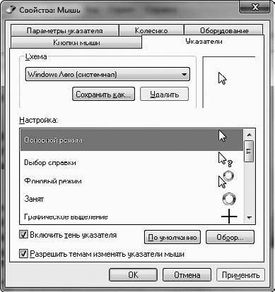 Еще одним достижением интерфейса Windows Aero можно считать набор изящных видов указателей мыши. Кроме того, как и в предыдущих версиях Windows, вы можете изменять вид указателя мыши для различных процессов. Для этого щелкните на ссылке Изменение указателей мыши в окне Персонализация (см. рис. 2.10). В открывшемся окне отобразятся примеры указателей для выбранной схемы (рис. 2.14).