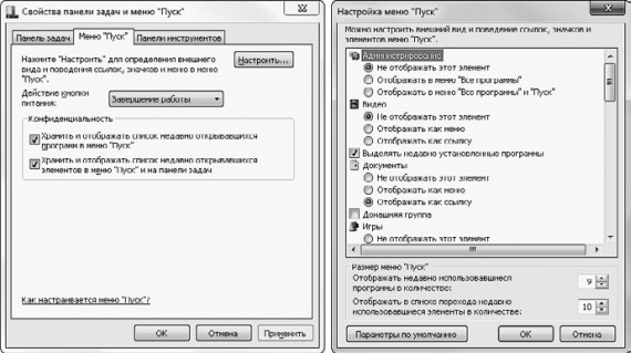 Рис. 2.18. Окна настройки меню Пуск