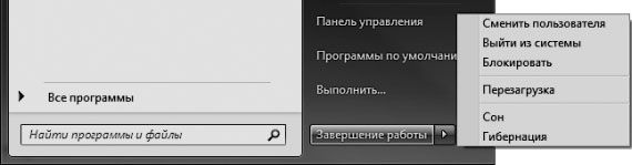 Чтобы выбрать дополнительное действие, следует щелкнуть в меню Пуск на треугольнике справа от кнопки Завершение работы. В результате появятся команды (рис. 2.22).