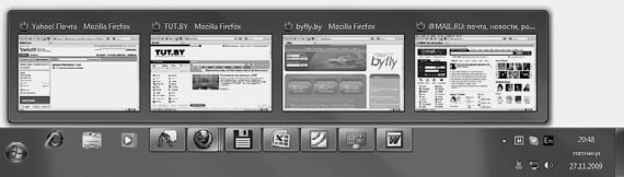 Как уже было сказано, наведя указатель мыши на ярлык запущенного приложения, расположенный на Панели задач, вы сможете увидеть эскиз конкретного открытого окна. Если таких процессов или программ запущено несколько, то, поскольку они все будут ассоциированы с одним значком, количество эскизов будет равно количеству запущенных копий (рис. 2.23).