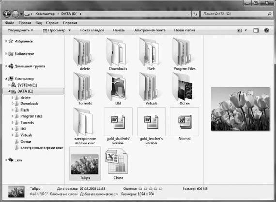? Область содержимого папки. Показывает значки файлов и папок, находящихся в открытой папке. Отображение значков в Проводнике Windows 7 значительно улучшилось. Теперь значок папки содержит эскизы файлов, находящихся внутри ее; при наличии вложенной папки она также отображается на значке в виде эскиза; значки мультимедийных файлов (рисунков, видео) также представлены в виде эскизов. Вариантов отображения значков по сравнению с предыдущими версиями Проводника стало больше. Подробнее об этом читайте ниже.