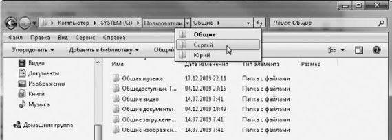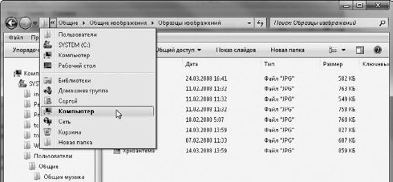 Выполните такую последовательность переходов по папкам: Пуск ? Компьютер ? Локальный диск (С:) ? Пользователи ? Общие. Обратите внимание на содержимое адресной строки: справа от названия каждой родительской папки имеется стрелка. Щелкнув на ней, вы развернете список дочерних папок и сможете перейти к любой из них (рис. 3.5).