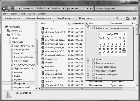 Чтобы сгруппировать объекты по определенному признаку, щелкните правой кнопкой мыши на свободном от папок или файлов участке окна, выполните команду Группировка и выберите нужный параметр. В результате значки будут распределены по группам, имеющим заголовки. Щелкнув на заголовке группы, вы сможете выделить все принадлежащие ей объекты. Двойным щелчком на заголовке можно сворачивать и разворачивать содержимое группы. Для отмены группировки снова щелкните правой кнопкой и выберите в подменю Группировка команду Нет.