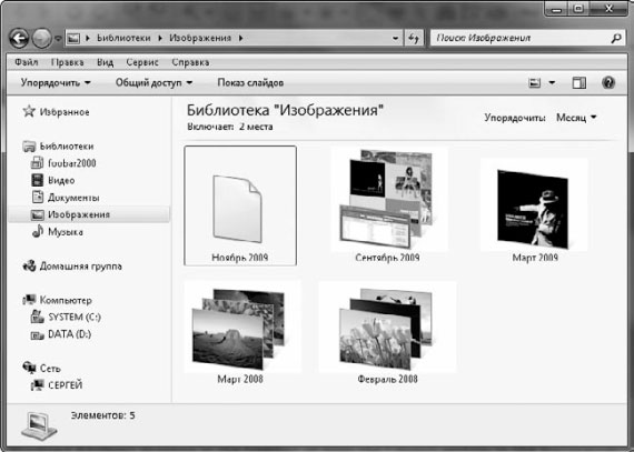 Как уже упоминалось выше, окна библиотек отличаются от окон обычных папок. Кроме ссылки Включает, которую мы уже обсудили, окна библиотек содержат другой параметр группировки – Упорядочить (см. рис. 3.2). Эта функция позволяет разложить содержимое библиотеки по стопкам. Данная операция подразумевает организацию файлов текущей библиотеки и всех ее вложенных папок в виде стопок по определенному признаку, за который отвечает один из столбцов. Щелкните на стрелке списка и выберите значение группировки. В результате в окне Проводника отобразятся значки стопок с названиями, которые совпадают с параметром группировки (рис. 3.13).