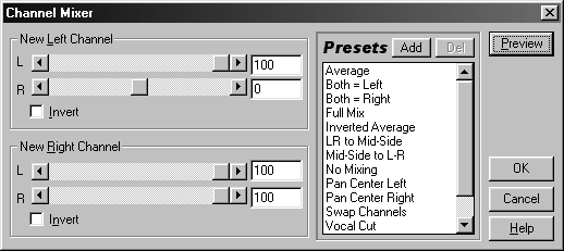 В левой части этого диалогового окна находятся две совершенно одинаковые группы элементов управления: New Left Channel (Новый левый канал) и New Right Channel (Новый правый канал), с помощью которых задаются уровни громкости исходных (до применения команды Channel Mixer (Микшер каналов)) каналов на новом (после применения команды Channel Mixer (Микшер каналов)) левом и правом каналах, соответственно. Уровень громкости исходного левого канала задается с помощью ползунка L, а уровень громкости исходного правого канала – с помощью ползунка R. Уровни громкости можно также задавать с помощью расположенных напротив ползунков L и R полей ввода, а изменять их можно в диапазоне от —100 до 100. Отрицательные значения означают инвертирование (зеркальное отображение относительно центральной линии) соответствующих исходных данных. Если установлен флажок Invert, то производится инвертирование данных соответствующего нового канала.