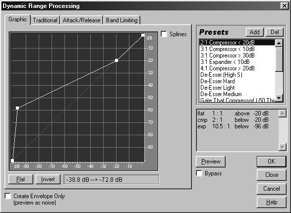 Команда Dynamics Processing (Динамическая обработка), предназначенная для изменения динамического диапазона, вызывает диалоговое окно Dynamic Range Processing (Обработка динамического диапазона). В этом окне есть четыре вкладки – Graphic (Графическая), Traditional (Традиционная), Attack/Release (Атака/освобождение) и Band Limiting (Ограничение частотной полосы). Есть также и постоянные элементы, которые присутствуют в нем независимо от того, какая из вкладок выбрана.