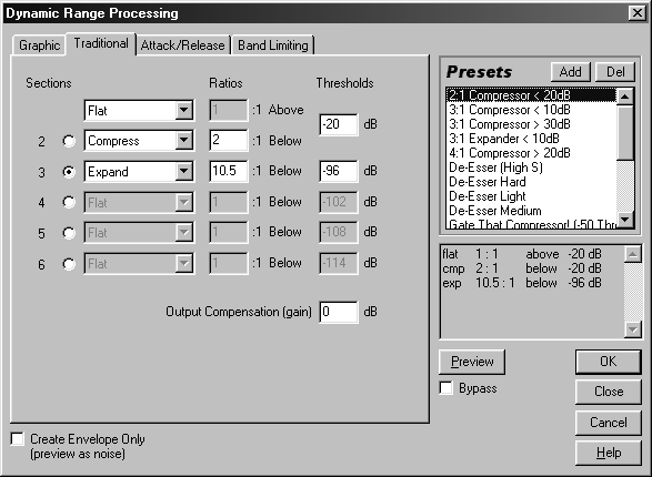 В правой верхней части диалогового окна Dynamic Range Processing (Обработка динамического диапазона) расположен список шаблонов Presets (Шаблоны). Работа с ним осуществляется обычным образом (см. описание команды Amplify (Усилить)). Под этим списком расположен список секций и их параметров. Еще ниже имеется кнопка предварительного прослушивания Preview (Предварительное прослушивание) и флажок Bypass (Обход). Если этот флажок установлен, то при нажатии кнопки Preview (Предварительное прослушивание) будет воспроизведена необработанная звуковая волна.