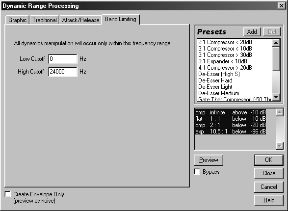 На этой вкладке определяется диапазон частот, к которому будет применяться изменение динамического диапазона. Нижняя граница этого диапазона задается в поле ввода Low Cutoff… Hz (Нижняя частота среза … Гц), а верхняя – в поле ввода High Cutoff… Hz (Верхняя частота среза … Гц).