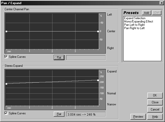 В этом окне имеются два графика – Center Channel Pan (Панорама центрального канала) и Stereo Expand (Стерео расширение). Под каждым из них находятся флажок Spline Curves (Кривые линии), кнопка Flat (Ровный) и поле, в котором отображаются координаты курсора мыши, когда он находится над областью рисования графика. Рисование графиков осуществляется как обычно (см. описание команды Dynamics Processing (Динамическая обработка)).