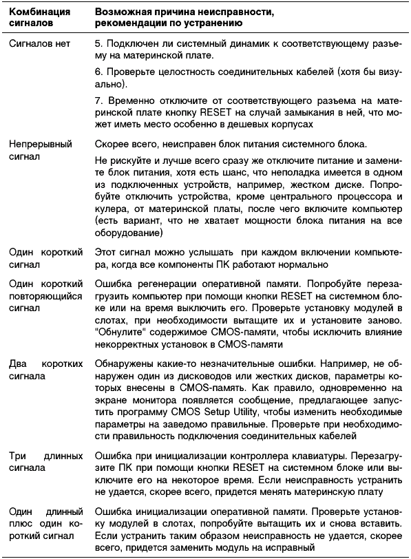 AWARD BIOS является наиболее известной торговой маркой, поэтому будет вполне достаточно изучить звуковые сигналы, характерные именно для этой BIOS. Несмотря на то, что «в народе» распространено несколько версий, например, v4.51G или v6.0, все они имеют сходные диагностические возможности, что сделано в основном для вашего же удобства. И даже после приобретения компании Award Software менее известной компанией Phoenix Technologies Ltd., специалисты последней оставили эти уже ставшие привычными комбинации сигналов неизменными (табл. 2.1). Кстати, до этого события в Phoenix BIOS были использованы совершенно другие комбинации сигналов, которые мы рассмотрим немного позже.